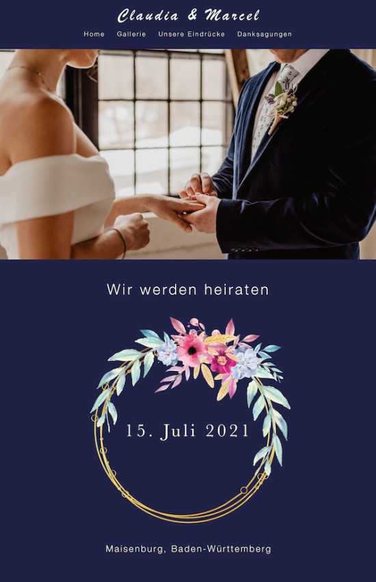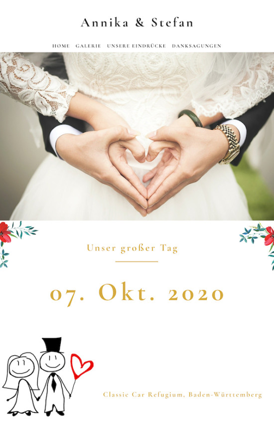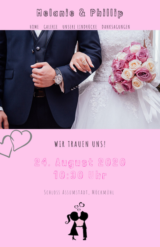 Wir erstellen Euch eine individuelle Website für Eure Hochzeit. Ladet Eure Hochzeitsbilder hoch und erstellt ein eindrucksvolles Portfolio. Tippt eure Eindrücke, witzige Momente, Danksagungen, Gefühle usw. nieder und schickt diese Hochzeitswebsite an alle an der Hochzeit eingeladenen Gäste und/oder beliebige Personen. Eine Hochzeitswebsite dient auch als Einladung für die Gäste. Gestaltet Eure Hochzeitswebsite, verfasst die Hochzeitseinladung mit Hochzeitsdatum und Allem was dazu gehört. Anschließend könnt Ihr diese Hochzeitswebsite an eure Gäste schicken.