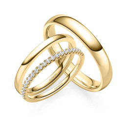 Ob Sie Eheringe bei Juwelieren einzeln anfertigen lassen, oder sich für vorgefertigte Eheringe entscheiden, sollten die Eheringe optisch wie auch materiell zueinander passen. Der breitere Trauring des Bräutigams fällt dabei in der Regel etwas dezenter und schlicht aus, der etwas schmalere Trauring der Braut hingegen kann mit funkelnden Diamanten verziert sein.